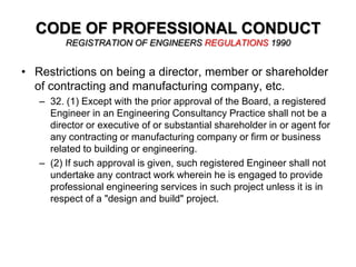 The fastest BEM class name generator. BEMs Code of Professional Conduct These are the code of professional conduct or ethics set by Board of Engineers Malaysia to prevent engineers from behaving and acting unethically. 11 A Professional Engineer shall approve and sign only those engineering documents that he has prepared or are prepared under his direct supervision.