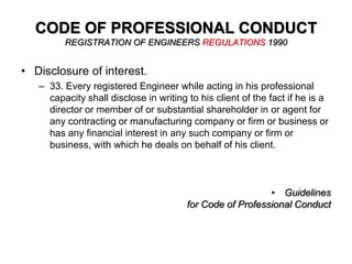 32005 GUIDELINES for CODE OF PROFESSIONAL CONDUCT 10 A Registered Engineer shall at all times hold paramount the safety health and welfare of the public. A violation of the guidelines under the Code of Conduct and the Code of Business Ethics in this manual may not only entail the violators liability under the provisions of applicable laws and regulations but in some case also result in the Companys liability under.